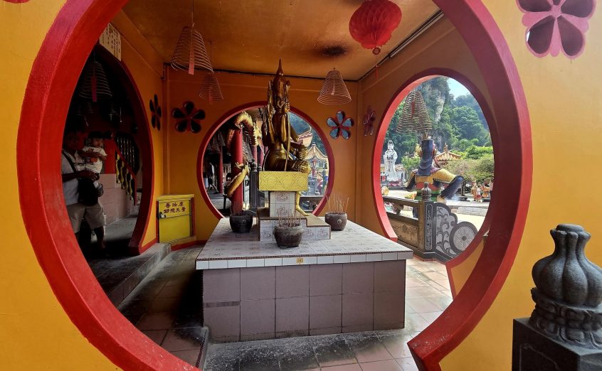 Ling Seng Tong feels exuberant and theatrical. Built against a limestone outcrop, it spills outward rather than inward. The courtyard is crowded with brightly painted statues, deities, animals, mythological figures, each colorful and almost cheeky. The overall effect is lively and accessible, a place where devotion and visual fun coexist.