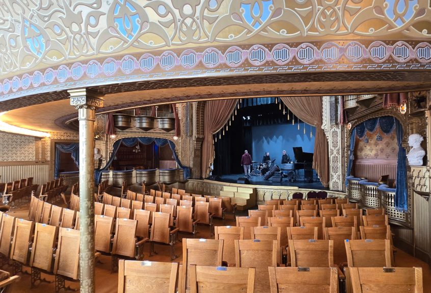The building feels improbably elaborate for its setting. No expense was spared on the interior which has been immaculately maintained. There are richly detailed hand-stenciled walls and ceilings, marble staircases, carved walnut and oak woodwork, gleaming brass fixtures, and stained-glass windows. The theater itself, a 300-seat auditorium, is gorgeous. One of its most distinctive features is the original Steere and Turner pipe organ, with 1,600 pipes, still in place and restored. Originally it was powered by water, now by electricity.